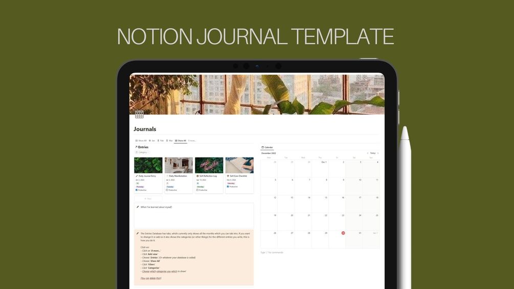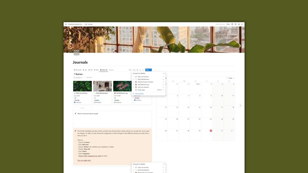 One main page that contains your journal database, calendar view and a section to reflect. In the Entries Database, you will get templates to different journal logs, like 'daily', 'manifestation log', 'self-care checklist' and more! You can choose to view only a month at a time, or which ever category you like.